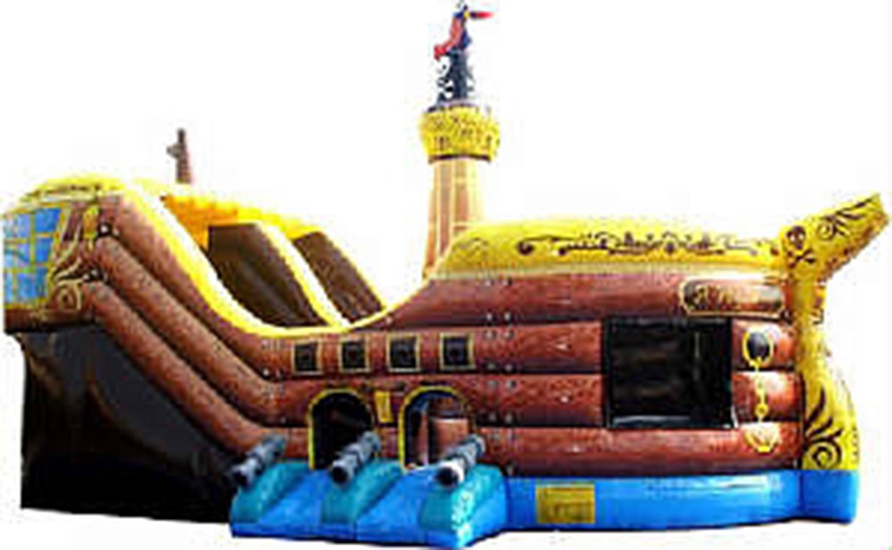 Our Pirate Ship Combo is huge, matey! It includes a rock climb wall, wide slide, and an oversize bounce area. It has a separate entrance and exit. It is perfect for any event and is surely an attention getter. New for 2018. 30' L x 18' W x 20' H Appropriate for pre-school thru 12 years Price includes delivery / setup / pickup