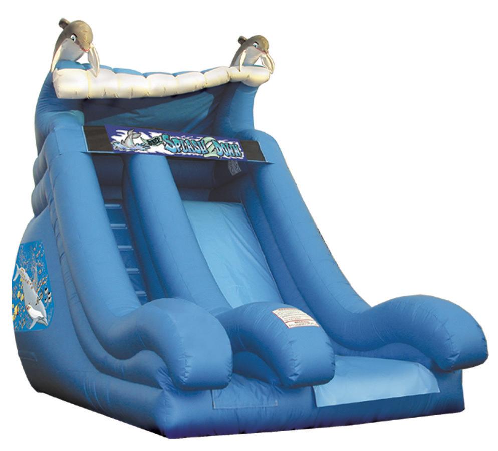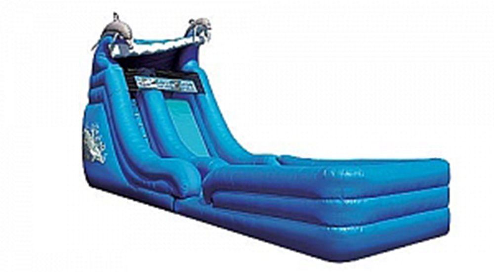 Our beautiful Blue Wave Dry Slide has two jumping dolphins on top and decorative graphics of dolphins swimming on the side. 18' L x 10' W x 18' H Appropriate for all ages Price includes delivery / setup / pickup