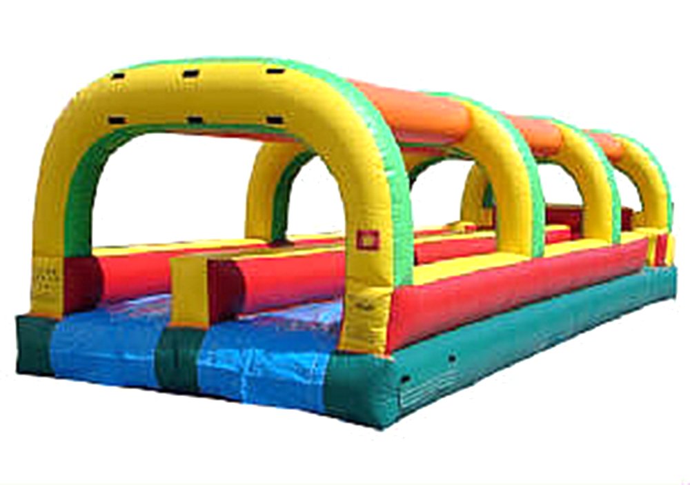 Our 2 Lane Slip n Slides are a wet, slippery blast. Yellow, orange, and green in color. Water sprays down from above onto the extra slick sliding lanes. This is an excellent unit for children through adults. 32' L x 10' W x 9' H Appropriate for all ages 3 AVAILABLE Customer must provide garden hose Price includes delivery / setup / pickup