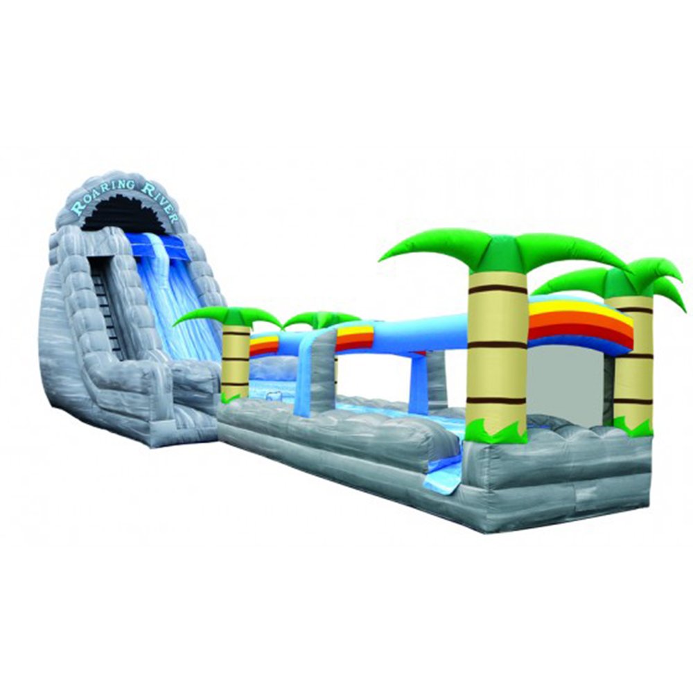 Our Roaring River Water Slide features a radical sliding angle that's sure to get the adrenaline pumping as riders scream down our 22' slide. At the bottom, riders continue down 31' of additional sliding fun before exiting this mind-blowing ride. Perfect for schools, churches, summer camps and more. New for 2018. 56' L x 13' W x 22' H Appropriate for all ages Customer must provide garden hose Price includes delivery / setup / pickup