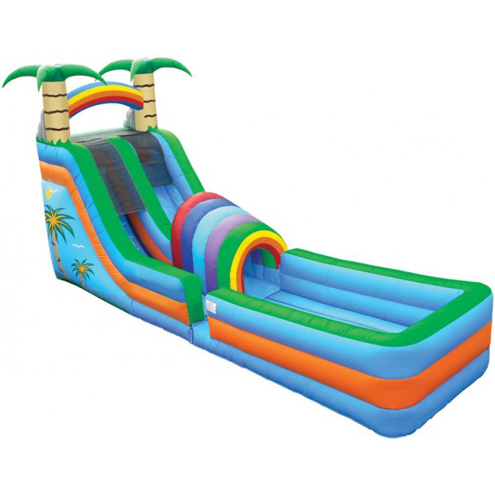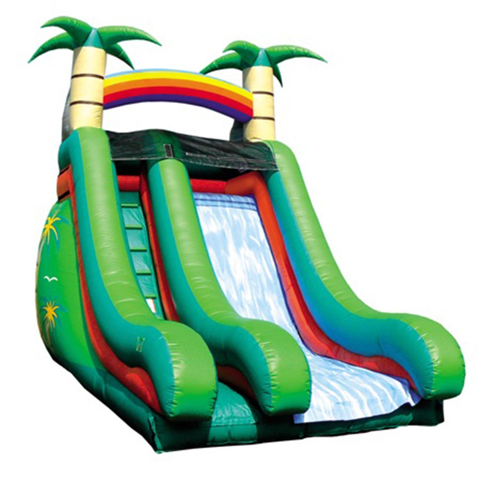 Our Tropical Dry Slide has palm trees and a rainbow theme. It also has decorative palm tree graphics on the side. If you cannot be in the tropics, you might as well have the tropics at home for your children. 18' L x 10' W x 18' H Appropriate for all ages Price includes delivery / setup / pickup
