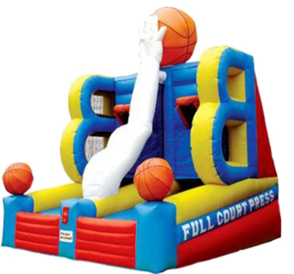 Get your game on! This basketball shootout has 2 players compete to shoot their 5 basketballs (10 total) into their basket before their opponent. Once the basket is made, the ball is returned on the opposing player's side. The first to sink 5 basketballs wins! Whether you bounce it off the backboard or get nothing but net, this game is sure to score points with kids & adults. Regulation size basketballs are provided. 16' L x 15' W x 18' H Appropriate for ages 6 thru adult Price includes delivery / setup / pickup