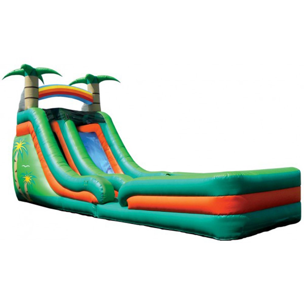 Our Tropical Water Slide w / Landing has two palm trees and a rainbow on top. It also has decorative palm tree graphics on the side. 33' L x 10' W x 18' H Appropriate for all ages Customer must provide garden hose Price includes delivery / setup / pickup