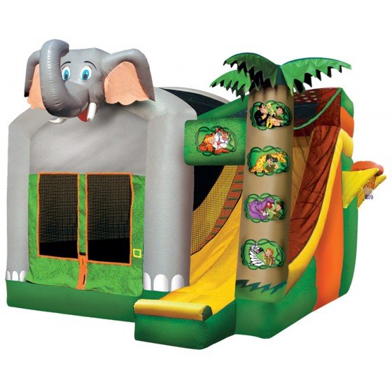 Our 4 in 1 Jungle Adventure Combo features palm trees, a safari theme, and a huge inflated elephant head that extends over the front entrance. It includes 140 square feet of bounce space, a basketball hoop, climb, and a 13-ft. slide with a 50-degree sliding angle. 15' L x 15' W x 17' H Appropriate for all ages 2 AVAILABLE Price includes delivery / setup / pickup