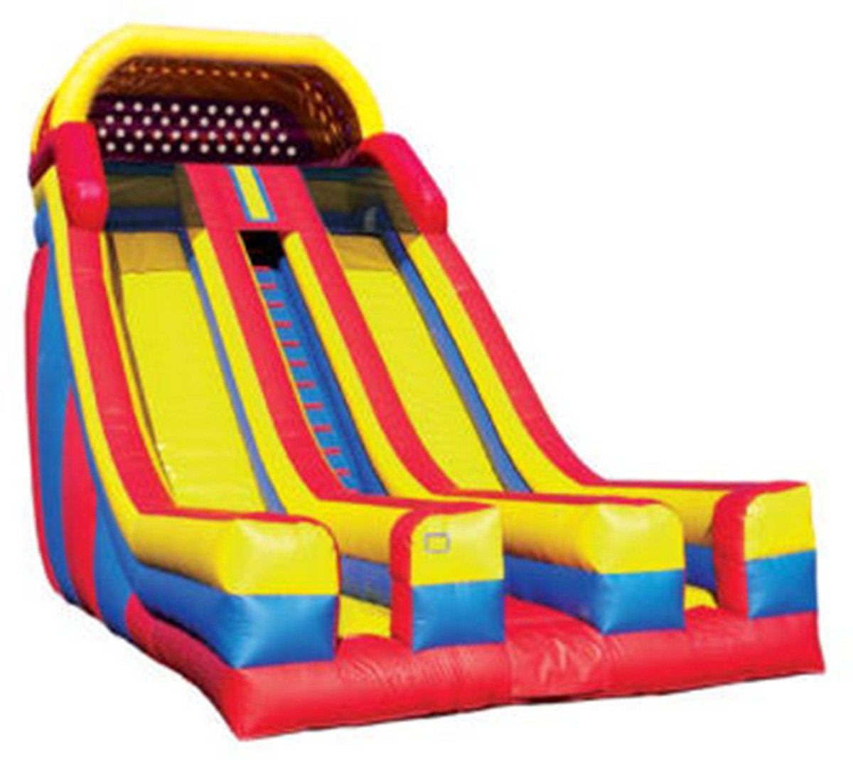 Our humongous dual lane dry slide is an excellent choice for fairs and festivals. This slide is not rented for backyard events. 33' L x 15' W x 24' H Appropriate for ages 5 thru adult Price includes delivery / setup / pickup