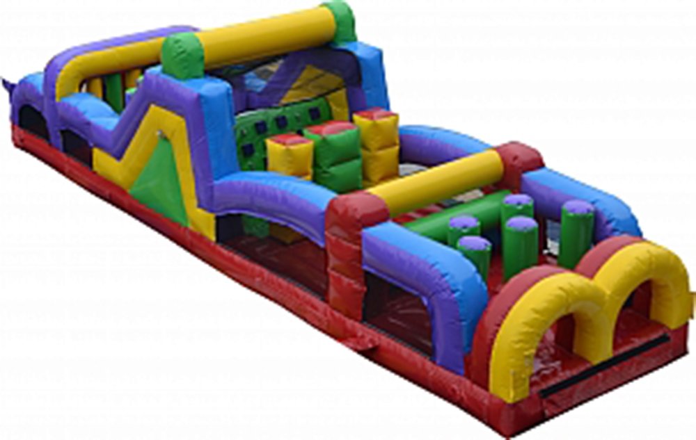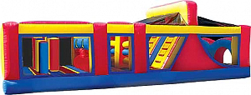 Our 40-foot MEGA Obstacle Course has several challenging obstacles in the front, including pop-ups, crawl through areas, and tunnels. After navigating your way through the many obstacles, you ascend the climbing area and experience the thrill of the huge, slick slide. If you are looking for both an obstacle course and a big slide, this is the unit. It is great for any type of party or event. 40' L x 10' W x 13' H Appropriate for all ages Price includes delivery / setup / pickup