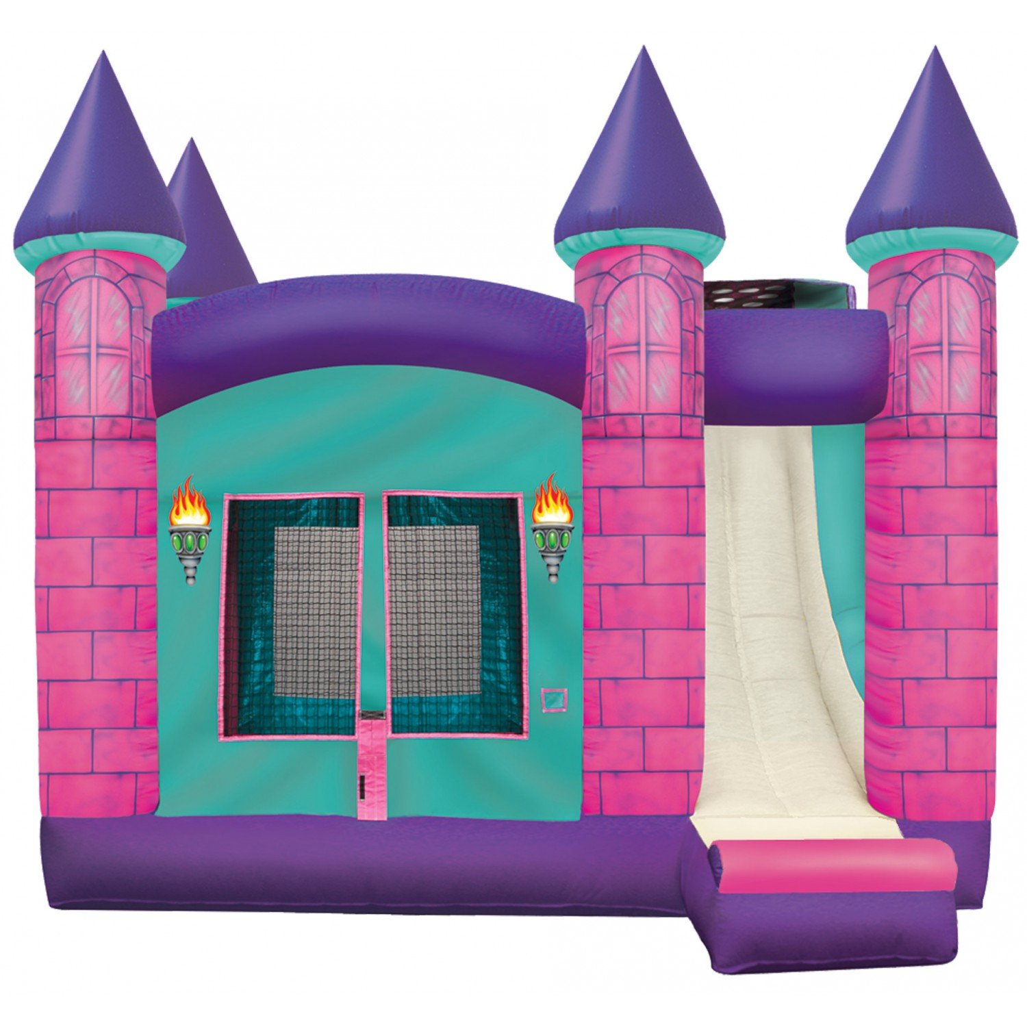 There is a princess inside of all of us. Our Princess Castle Combo has a beautiful color scheme. This combo will surely make your daughter's dreams come true. It includes 140 square feet of bounce space, an indoor basketball hoop, climb, and a 13-ft. slide with a 50-degree sliding angle. 15' L x 15' W x 17' H Appropriate for all ages Price includes delivery / setup / pickup