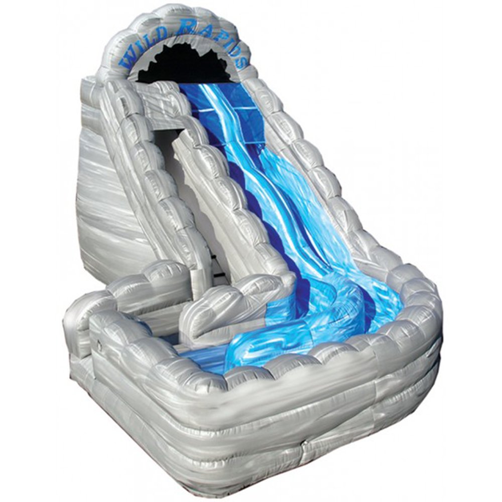 Our Wild Rapids Water Slide with Landing is an exhilarating, two lane water slide. Riders shoot down the individual sliding lanes where they encounter the thrill of a bump in the rapids before they scream around the curve and make a soft landing. 25' L x 16' W x 18' H Appropriate for all ages Customer must provide garden hose Price includes delivery / setup / pickup
