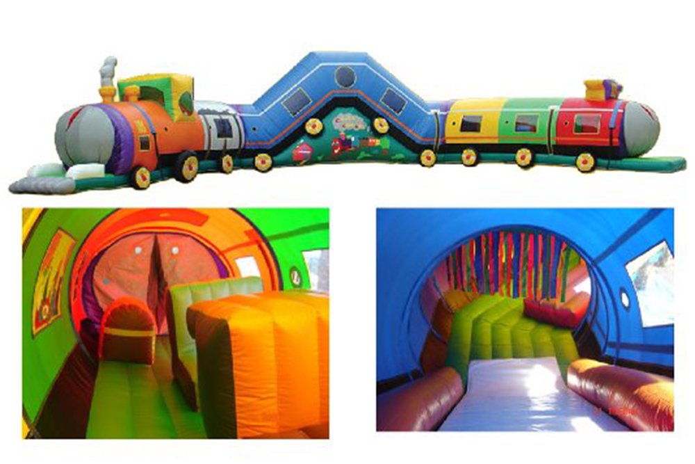 Our 47' Chuggy Choo Choo is a fantastic, enclosed obstacle course that is appropriate for pre-school thru 6th grade. Participants enter at the engine, navigate their way through the train, experience the slide in the middle, and exit via the caboose. Unique features inside the train add to this fun-filled unit. 47' L x 15' W x 10' H Appropriate for pre-school thru 6th grade Price includes delivery / setup / pickup