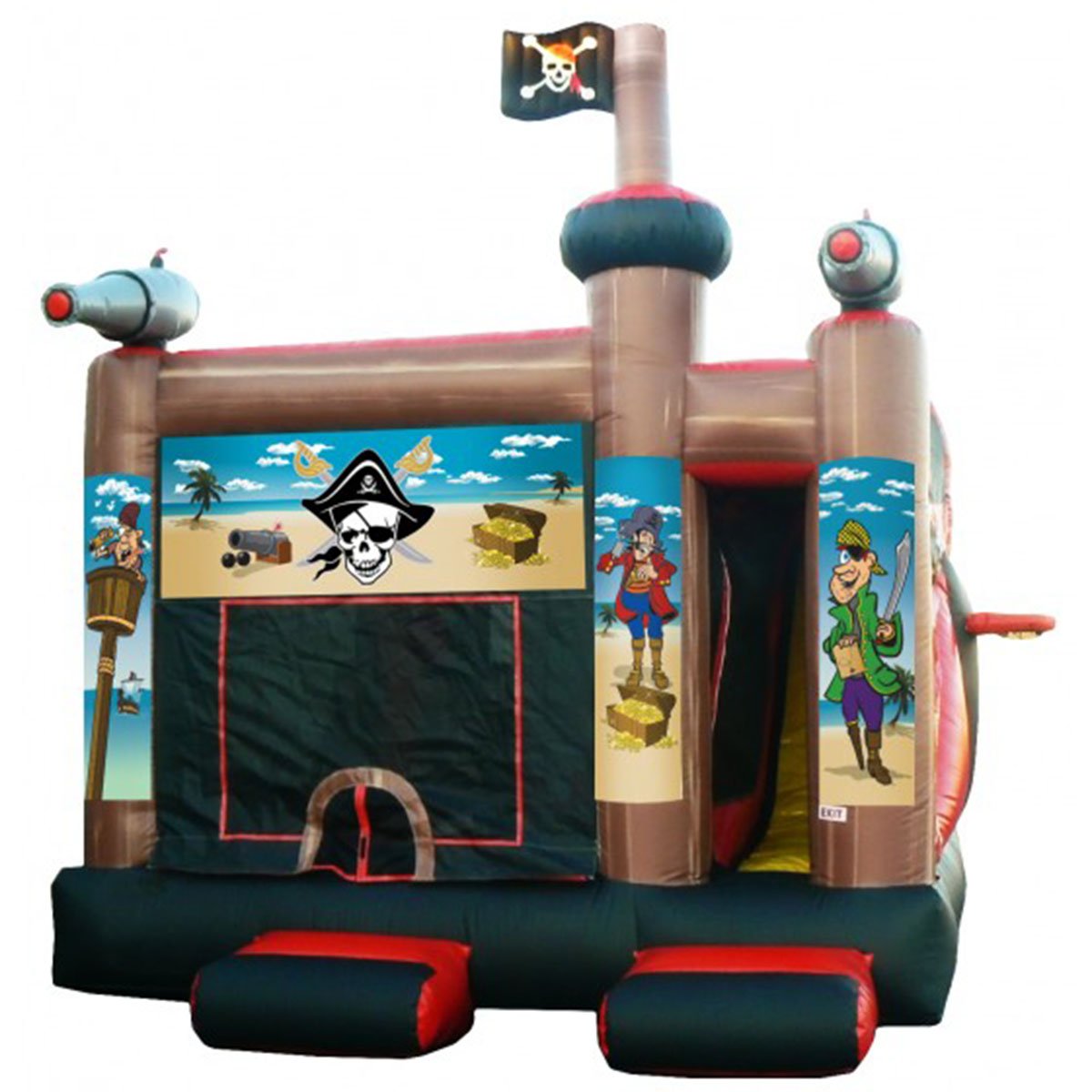 Shiver me timbers! Our Pirate Combo has two large cannons on each corner and a comical skull and crossbones flag that extends from the top. It also has exceptional pirate-themed graphics. It includes 140 square feet of bounce space, an indoor basketball hoop, climb, and a 13 ft. slide with a 50 degree sliding angle. 15' L x 15' W x 17' H Appropriate for all ages Price includes delivery / setup / pickup