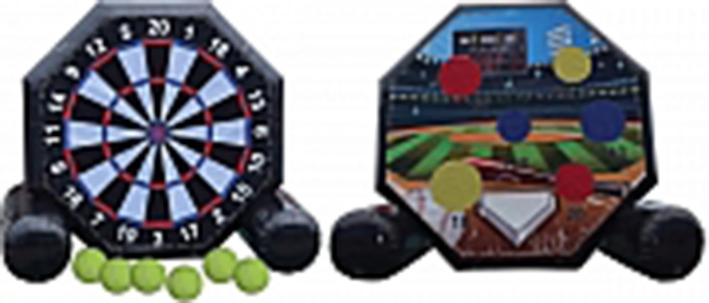 Two games in one! A cross between a giant Velcro dartboard and a soccer game. Players kick Velcro covered balls to collect points. It's darts you can play with your feet. A dartboard on one side, and a baseball-themed game on the other side. Includes six (6) balls. 9' L x 19' W x 16' H Appropriate for all ages Price includes delivery / setup / pickup